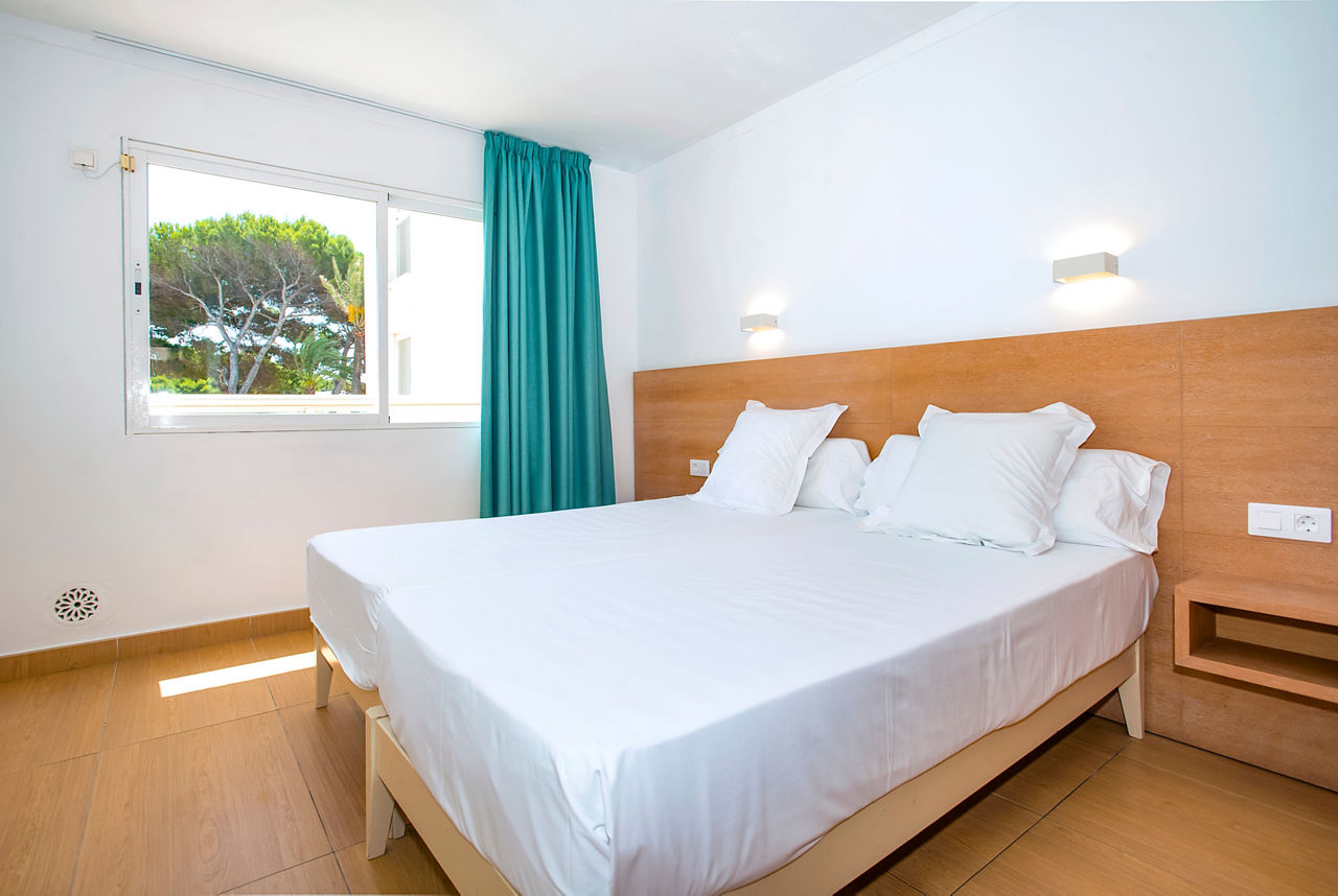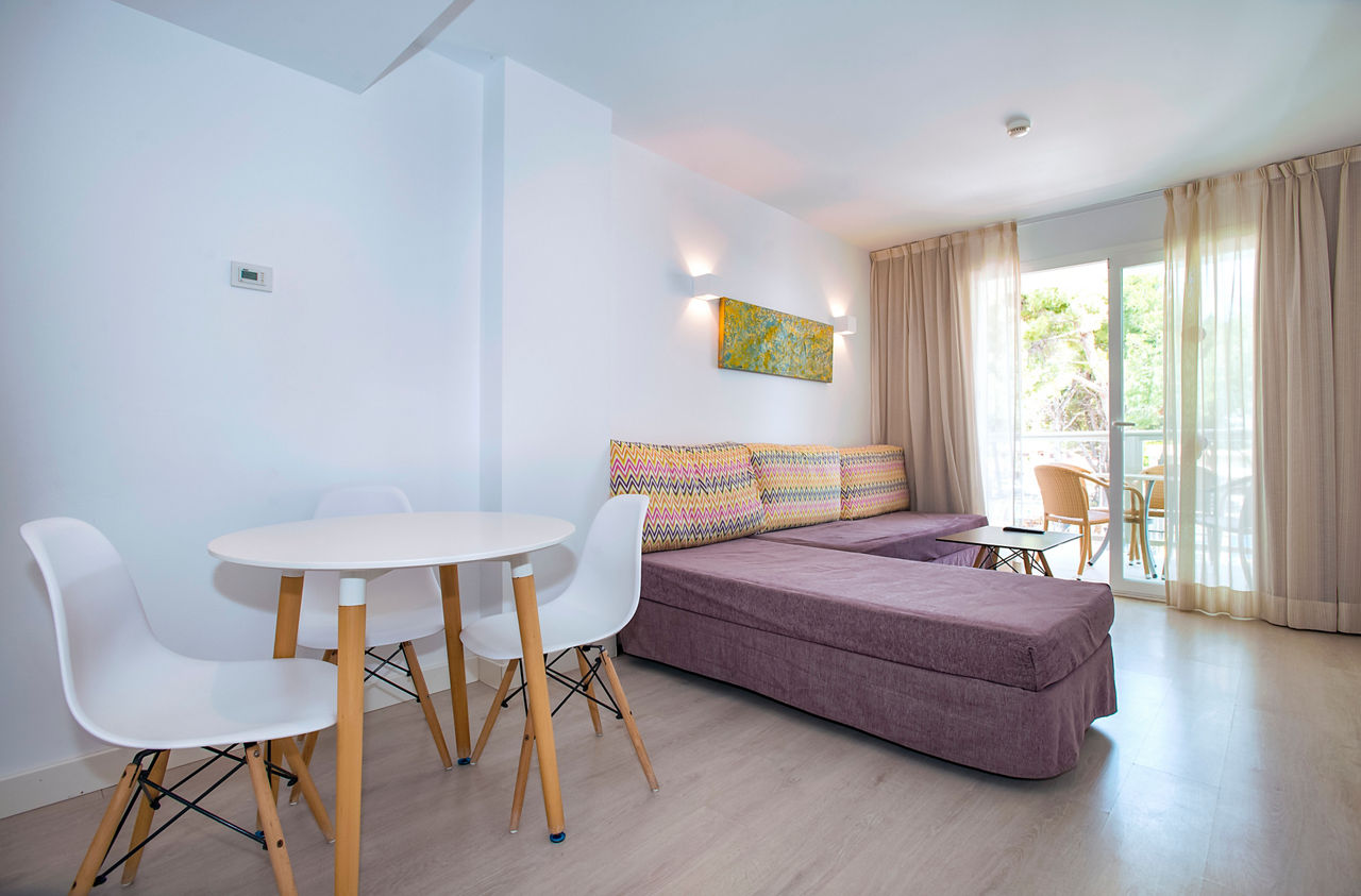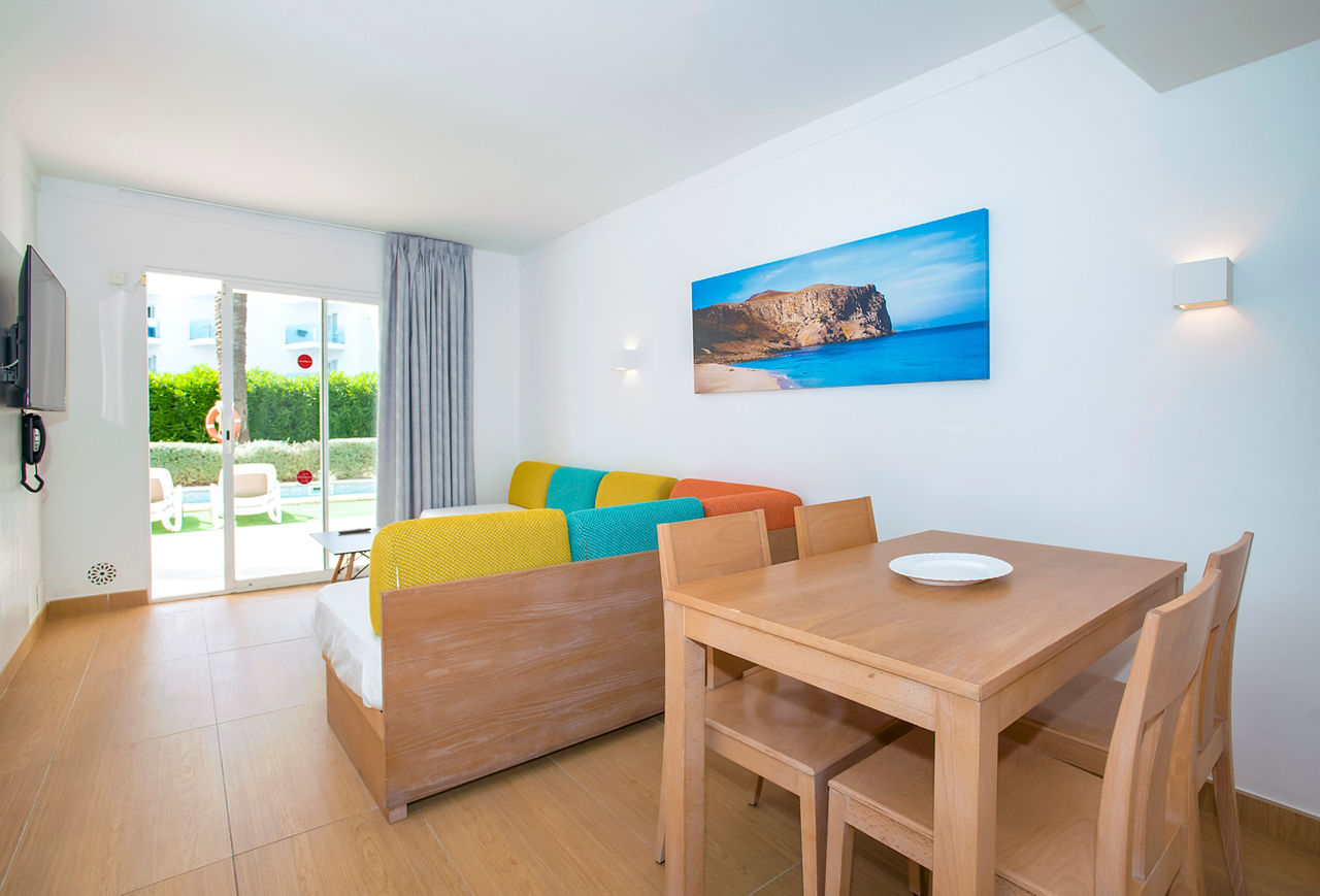 Aparthotel Ses Fotges boasts an excellent location just steps from the golden sandy beach and offers a packed entertainment programme. The buffet restaurant serves a variety of delicious dishes, catering to all tastes. Guests can choose from modern studios or apartments, with the option to upgrade to a sea view or swim-up apartment for an extra special experience. With a variety of board options, stunning surroundings, and exceptional facilities, Aparthotel Ses Fotges is the perfect choice for couples, groups, and families alike.Studios sleep up to 2 adults and 2 children and have bathroom containing a shower, air conditioning, hairdryer, television, fridge, microwave and balcony or terrace. One Bedroom apartments also available.